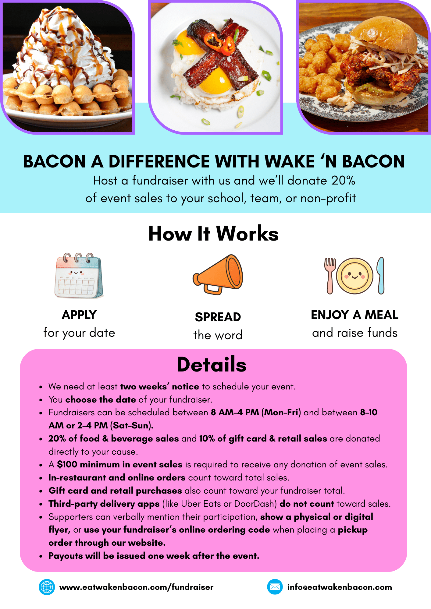 Looking for a fun and delicious way to give back? Wake ’n Bacon in Lakeview, Chicago makes fundraising easy — and tasty! Whether you’re organizing a school fundraiser, team fundraiser, or community fundraising event, we’ll donate 20% of food and beverage sales (plus 10% of gift card and retail sales) directly to your cause. Simply choose your date, spread the word, and let us handle the rest while your supporters enjoy Chicago’s most photo-worthy brunch.